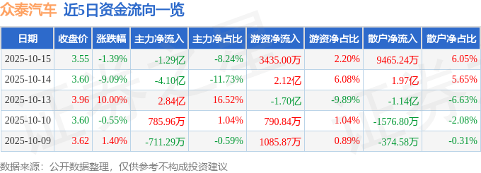 证券之星消息,截至2025年10月15日收盘,众泰汽车(000980)报收于3.55元,下跌1.39%,换手率8.87%,成交量446.44万手,成交额15.65亿元。