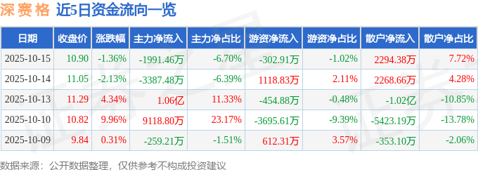 证券之星消息,截至2025年10月15日收盘,深 赛 格(000058)报收于10.9元,下跌1.36%,换手率2.77%,成交量27.31万手,成交额2.97亿元。