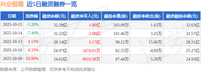 兴业银锡融资融券信息显示,融资方面,当日融资买入6.06亿元,融资偿还5.0亿元,融资净买入1.06亿元,连续3日净买入累计7.31亿元。融券方面,融券卖出3.58万股,融券偿还1.95万股,融券余量103.09万股,融券余额3561.76万元。融资融券余额32.63亿元。