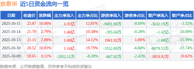 证券之星消息,截至2025年10月15日收盘,京泉华(002885)报收于23.87元,上涨10.0%,涨停,换手率20.69%,成交量47.78万手,成交额10.92亿元。