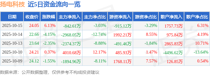 证券之星消息,截至2025年10月15日收盘,扬电科技(301012)报收于24.05元,上涨6.13%,换手率8.24%,成交量11.82万手,成交额2.79亿元。
