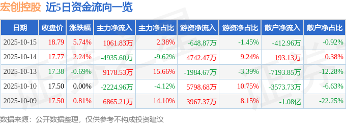 证券之星消息,截至2025年10月15日收盘,宏创控股(002379)报收于18.79元,上涨5.74%,换手率2.13%,成交量24.21万手,成交额4.47亿元。