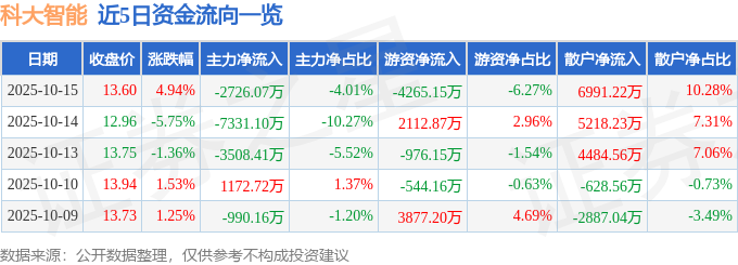 证券之星消息,截至2025年10月15日收盘,科大智能(300222)报收于13.6元,上涨4.94%,换手率8.1%,成交量51.33万手,成交额6.8亿元。