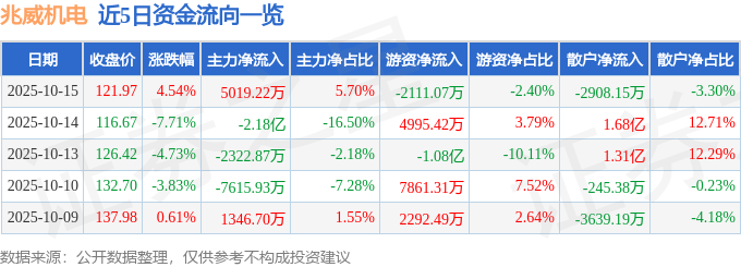 证券之星消息,截至2025年10月15日收盘,兆威机电(003021)报收于121.97元,上涨4.54%,换手率3.57%,成交量7.38万手,成交额8.81亿元。
