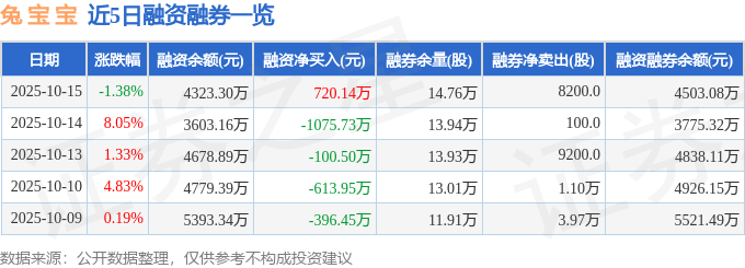 兔 宝 宝融资融券信息显示,融资方面,当日融资买入1535.69万元,融资偿还815.55万元,融资净买入720.14万元。融券方面,融券卖出8200.0股,融券偿还0.0股,融券余量14.76万股,融券余额179.78万元。融资融券余额4503.08万元。