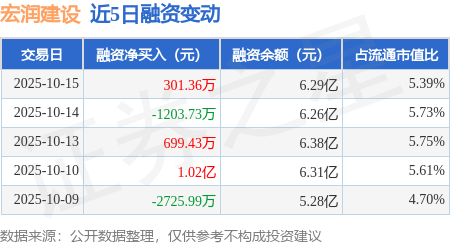证券之星消息,10月15日,宏润建设(002062)融资买入5081.9万元,融资偿还4780.54万元,融资净买入301.36万元,融资余额6.29亿元。