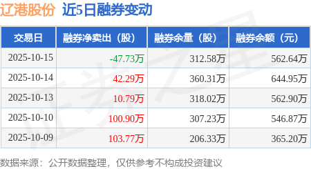 证券之星消息,10月15日,辽港股份(601880)融资买入3020.11万元,融资偿还2796.8万元,融资净买入223.3万元,融资余额2.13亿元。