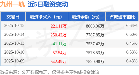 证券之星消息,10月15日,九州一轨(688485)融资买入484.54万元,融资偿还263.42万元,融资净买入221.11万元,融资余额8008.96万元,近20个交易日中有11个交易日出现融资净买入。