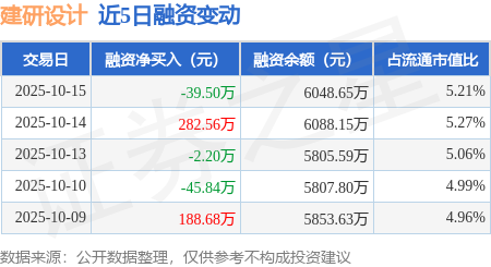 证券之星消息,10月15日,建研设计(301167)融资买入613.28万元,融资偿还652.79万元,融资净卖出39.5万元,融资余额6048.65万元。