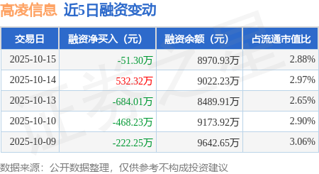 证券之星消息,10月15日,高凌信息(688175)融资买入398.37万元,融资偿还449.67万元,融资净卖出51.3万元,融资余额8970.93万元。