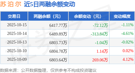 证券之星消息,10月15日,苏 泊 尔(002032)融资买入582.73万元,融资偿还655.35万元,融资净卖出72.63万元,融资余额6371.14万元,近20个交易日中有11个交易日出现融资净买入。