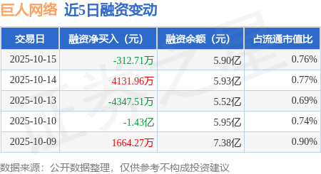 证券之星消息,10月15日,巨人网络(002558)融资买入9322.26万元,融资偿还9634.97万元,融资净卖出312.71万元,融资余额5.9亿元。