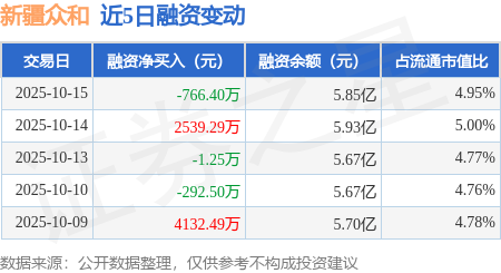 证券之星消息,10月15日,新疆众和(600888)融资买入4024.6万元,融资偿还4791.0万元,融资净卖出766.4万元,融资余额5.85亿元。