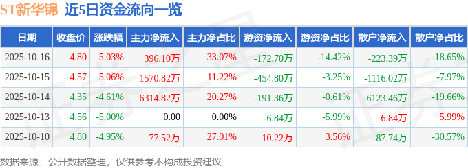 证券之星消息,截至2025年10月16日收盘,ST新华锦(600735)报收于4.8元,上涨5.03%,换手率0.59%,成交量2.5万手,成交额1197.65万元。