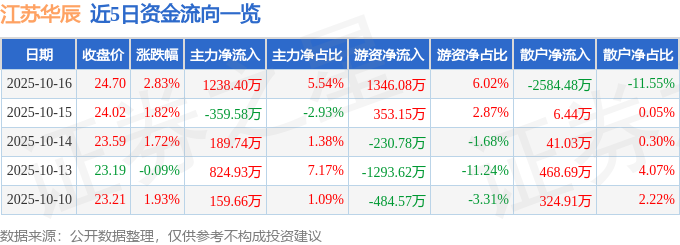 证券之星消息,截至2025年10月16日收盘,江苏华辰(603097)报收于24.7元,上涨2.83%,换手率5.68%,成交量9.09万手,成交额2.24亿元。