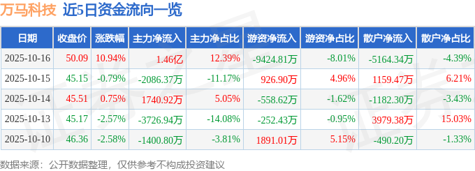 证券之星消息,截至2025年10月16日收盘,万马科技(300698)报收于50.09元,上涨10.94%,换手率19.99%,成交量23.7万手,成交额11.77亿元。