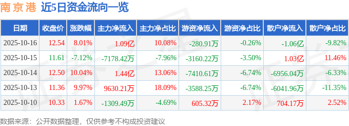 证券之星消息,截至2025年10月16日收盘,南 京 港(002040)报收于12.54元,上涨8.01%,换手率18.24%,成交量88.66万手,成交额10.81亿元。