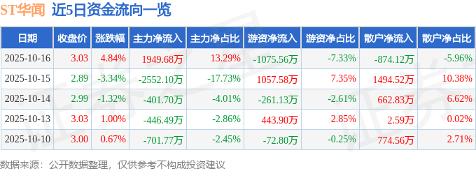 证券之星消息,截至2025年10月16日收盘,ST华闻(000793)报收于3.03元,上涨4.84%,换手率2.51%,成交量49.22万手,成交额1.47亿元。