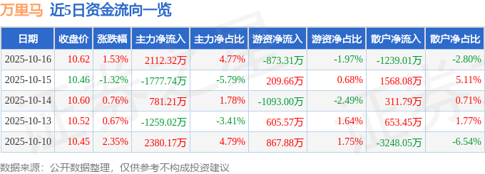证券之星消息,截至2025年10月16日收盘,万里马(300591)报收于10.62元,上涨1.53%,换手率11.91%,成交量41.74万手,成交额4.43亿元。