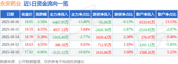 证券之星消息,截至2025年10月16日收盘,永安药业(002365)报收于18.85元,下跌3.58%,换手率10.38%,成交量25.49万手,成交额4.83亿元。