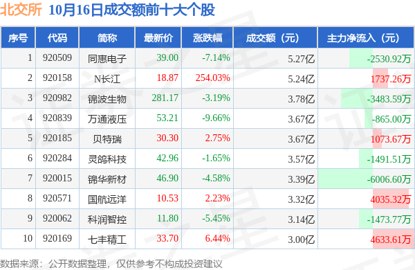 当日北交所成交额前10大个股中4只个股收涨,平均涨幅66.36%,其中同惠电子(920509)以成交额5.27亿元排第一。从主力资金流入看,成交额前10大个股中有4只个股呈现主力资金净流入。