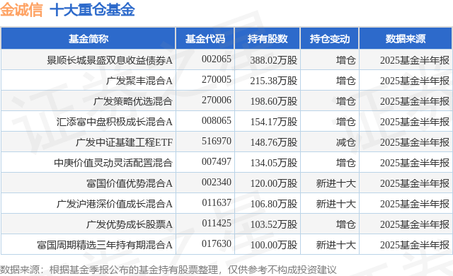 根据2025基金半年报公募基金重仓股数据,重仓该股的公募基金共91家,其中持有数量最多的公募基金为景顺长城基金的景顺长城景盛双息收益债券A。景顺长城景盛双息收益债券A目前规模为105.57亿元,最新净值1.23(10月15日),较上一交易日上涨0.24%,近一年上涨9.43%。该公募基金现任基金经理为李怡文 邹立虎 李曾卓卓。李怡文在任的基金产品包括:景顺长城景颐双利债券A,管理时间为2021年4月30日至今,期间收益率为24.4%;景顺景颐招利6个月持有期债券A,管理时间为2021年4月30日至今,期间收益率为33.67%;景顺长城安泽回报一年持有混合A,管理时间为2021年4月30日至今,期间收益率为38.7%;景顺景颐嘉利6个月持有期债券A,管理时间为2021年6月16日至今,期间收益率为22.73%。邹立虎在任的基金产品包括:景顺长城安盈回报一年持有混合A,管理时间为2021年11月16日至今,期间收益率为42.31%;景顺景颐招利6个月持有期债券A,管理时间为2022年3月12日至今,期间收益率为26.09%;景顺长城华城稳健6个月持有期混合A,管理时间为2022年3月12日至今,期间收益率为29.85%。