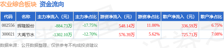 从资金流向上来看,当日农业综合板块主力资金净流出2186.83万元,游资资金净流入1124.53万元,散户资金净流入1062.3万元。农业综合板块个股资金流向见下表: