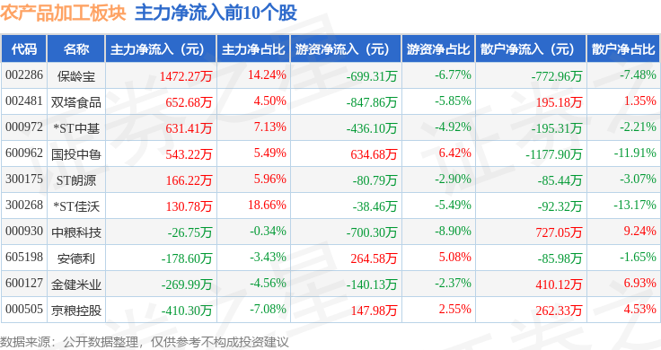 从资金流向上来看,当日农产品加工板块主力资金净流出1.59亿元,游资资金净流入3992.48万元,散户资金净流入1.19亿元。农产品加工板块个股资金流向见下表: