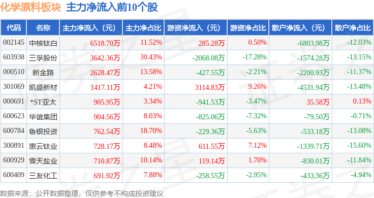 从资金流向上来看,当日化学原料板块主力资金净流出2.5亿元,游资资金净流入2.3亿元,散户资金净流入2071.19万元。化学原料板块个股资金流向见下表: