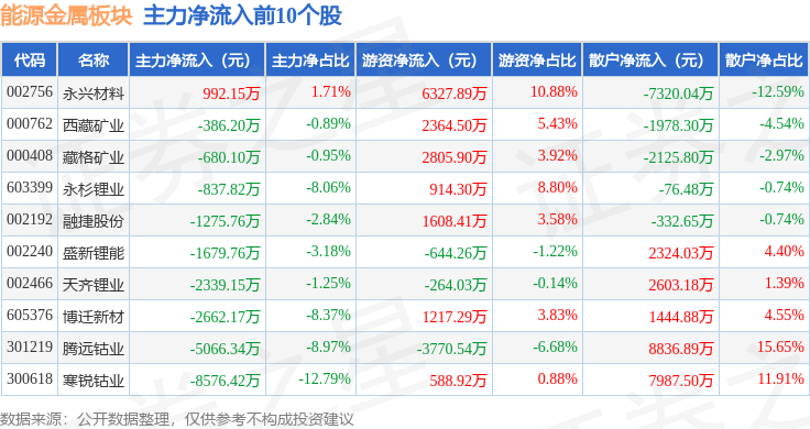 从资金流向上来看,当日能源金属板块主力资金净流出12.13亿元,游资资金净流入3.05亿元,散户资金净流入9.07亿元。能源金属板块个股资金流向见下表: