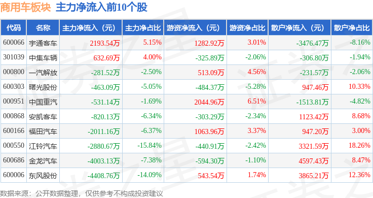从资金流向上来看,当日商用车板块主力资金净流出3.84亿元,游资资金净流入3307.38万元,散户资金净流入3.51亿元。商用车板块个股资金流向见下表: