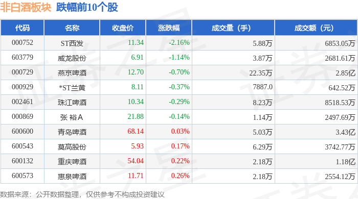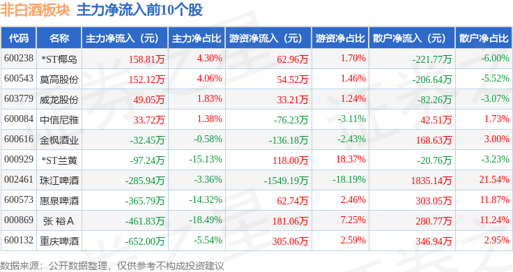 从资金流向上来看,当日非白酒板块主力资金净流出1.29亿元,游资资金净流出5570.17万元,散户资金净流入1.84亿元。非白酒板块个股资金流向见下表: