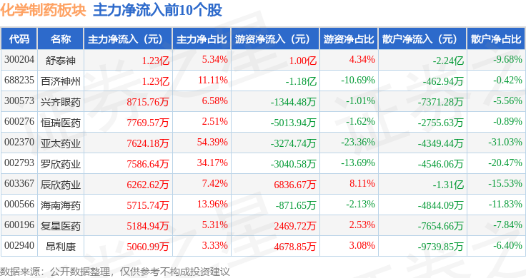 从资金流向上来看,当日化学制药板块主力资金净流出1822.69万元,游资资金净流入8.55亿元,散户资金净流出8.37亿元。化学制药板块个股资金流向见下表: