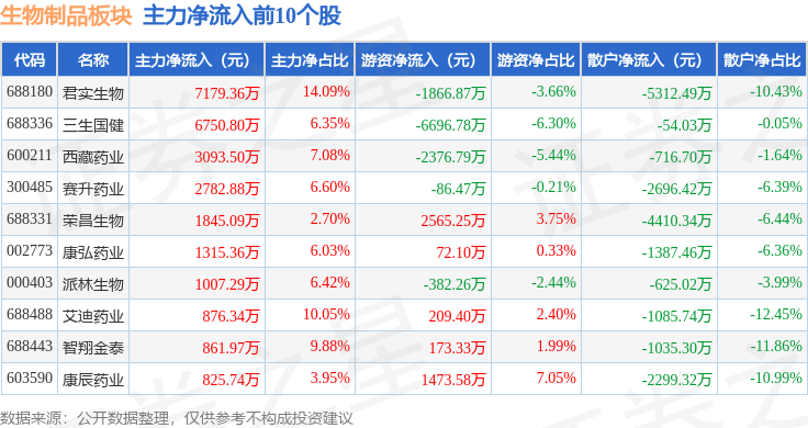 从资金流向上来看,当日生物制品板块主力资金净流出275.82万元,游资资金净流入1.42亿元,散户资金净流出1.4亿元。生物制品板块个股资金流向见下表: