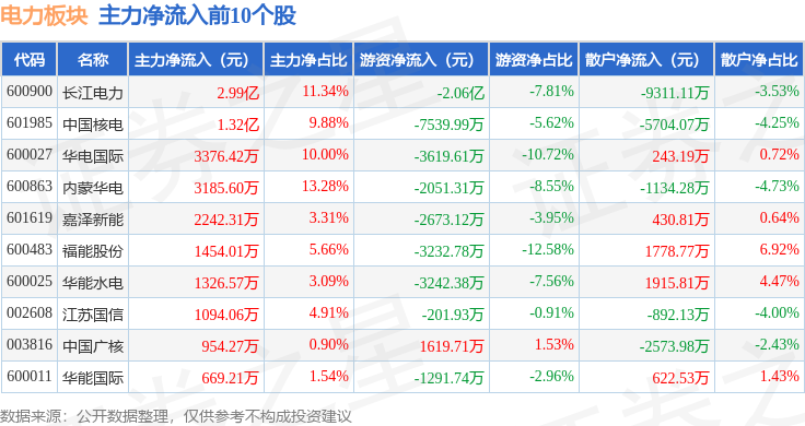 从资金流向上来看,当日电力板块主力资金净流出13.32亿元,游资资金净流出2.58亿元,散户资金净流入15.91亿元。电力板块个股资金流向见下表:
