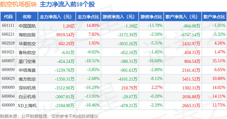 从资金流向上来看,当日航空机场板块主力资金净流入7716.5万元,游资资金净流出2.73亿元,散户资金净流入1.96亿元。航空机场板块个股资金流向见下表: