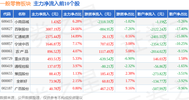 从资金流向上来看,当日一般零售板块主力资金净流出7.66亿元,游资资金净流入1.7亿元,散户资金净流入5.96亿元。一般零售板块个股资金流向见下表:
