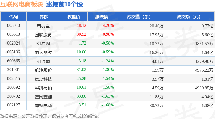 证券之星消息,10月16日互联网电商板块较上一交易日下跌0.79%,星徽股份领跌。当日上证指数报收于3916.23,上涨0.1%。深证成指报收于13086.41,下跌0.25%。互联网电商板块个股涨跌见下表: