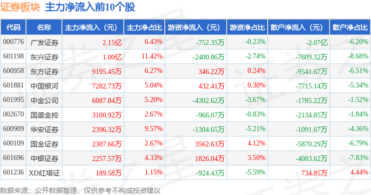 从资金流向上来看,当日证券板块主力资金净流出17.2亿元,游资资金净流入12.05亿元,散户资金净流入5.15亿元。证券板块个股资金流向见下表: