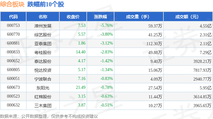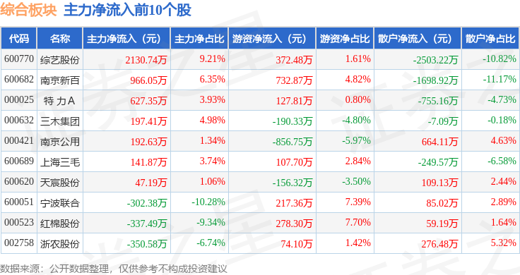 从资金流向上来看,当日综合板块主力资金净流出1.74亿元,游资资金净流入7280.67万元,散户资金净流入1.02亿元。综合板块个股资金流向见下表: