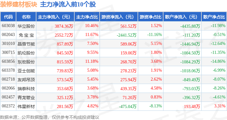 从资金流向上来看,当日装修建材板块主力资金净流出3.11亿元,游资资金净流入1.18亿元,散户资金净流入1.93亿元。装修建材板块个股资金流向见下表: