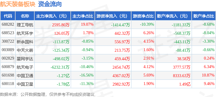 从资金流向上来看,当日航天装备板块主力资金净流出3.48亿元,游资资金净流入1.01亿元,散户资金净流入2.47亿元。航天装备板块个股资金流向见下表: