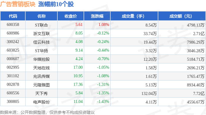 从资金流向上来看,当日广告营销板块主力资金净流出6.84亿元,游资资金净流入1.03亿元,散户资金净流入5.81亿元。广告营销板块个股资金流向见下表: