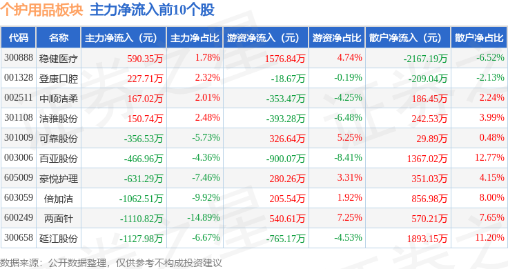 从资金流向上来看,当日个护用品板块主力资金净流出4821.64万元,游资资金净流入1022.82万元,散户资金净流入3798.82万元。个护用品板块个股资金流向见下表: