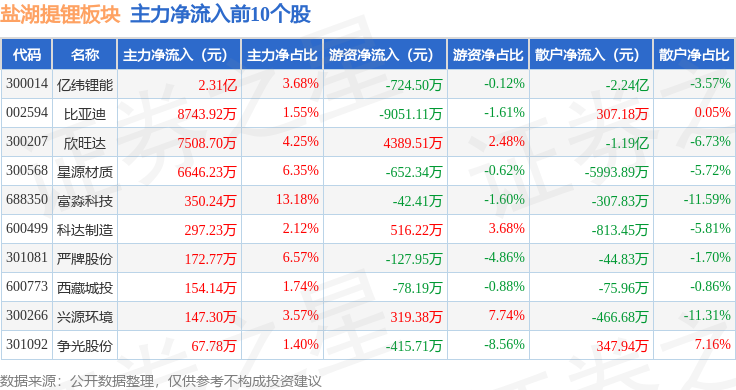 从资金流向上来看,当日盐湖提锂板块主力资金净流出17.29亿元,游资资金净流入3.58亿元,散户资金净流入13.71亿元。盐湖提锂板块个股资金流向见下表: