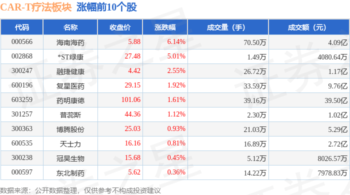 证券之星消息,10月16日CAR-T疗法板块较上一交易日上涨0.48%,海南海药领涨。当日上证指数报收于3916.23,上涨0.1%。深证成指报收于13086.41,下跌0.25%。CAR-T疗法板块个股涨跌见下表: