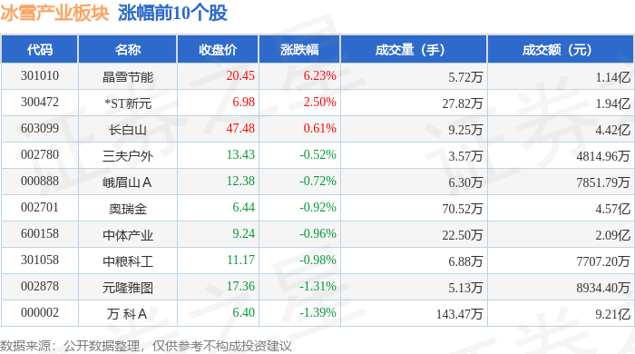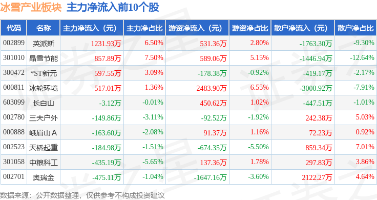 从资金流向上来看,当日冰雪产业板块主力资金净流出3.67亿元,游资资金净流入6979.89万元,散户资金净流入2.98亿元。冰雪产业板块个股资金流向见下表: