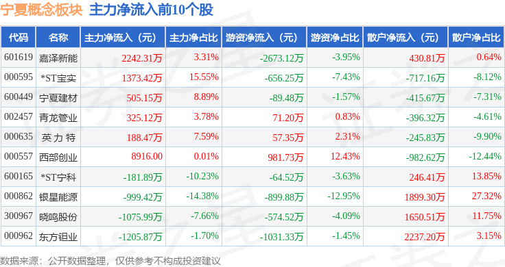 从资金流向上来看,当日宁夏概念板块主力资金净流出8004.53万元,游资资金净流出539.84万元,散户资金净流入8544.38万元。宁夏概念板块个股资金流向见下表: