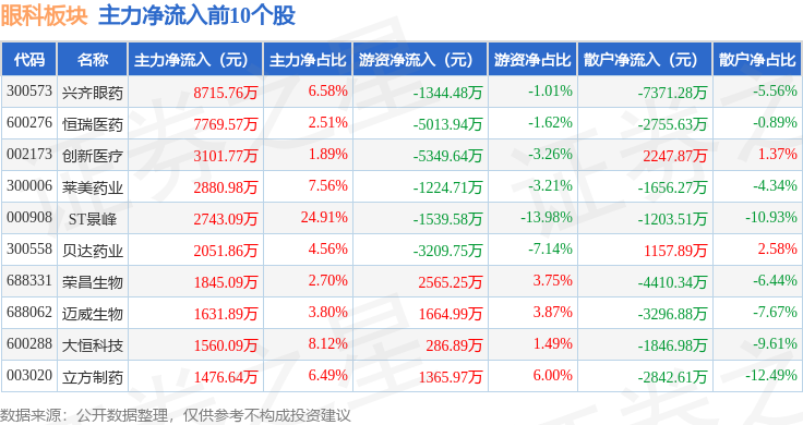 从资金流向上来看,当日眼科板块主力资金净流入2.02亿元,游资资金净流出3631.94万元,散户资金净流出1.65亿元。眼科板块个股资金流向见下表: