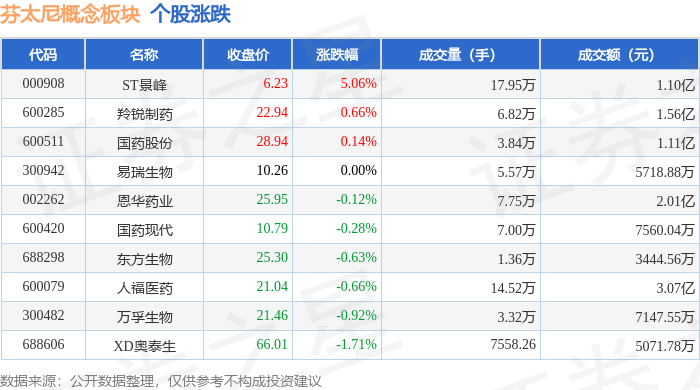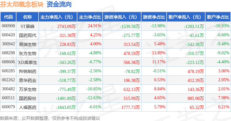 从资金流向上来看,当日芬太尼概念板块主力资金净流出2156.54万元,游资资金净流入2496.57万元,散户资金净流出340.03万元。芬太尼概念板块个股资金流向见下表: